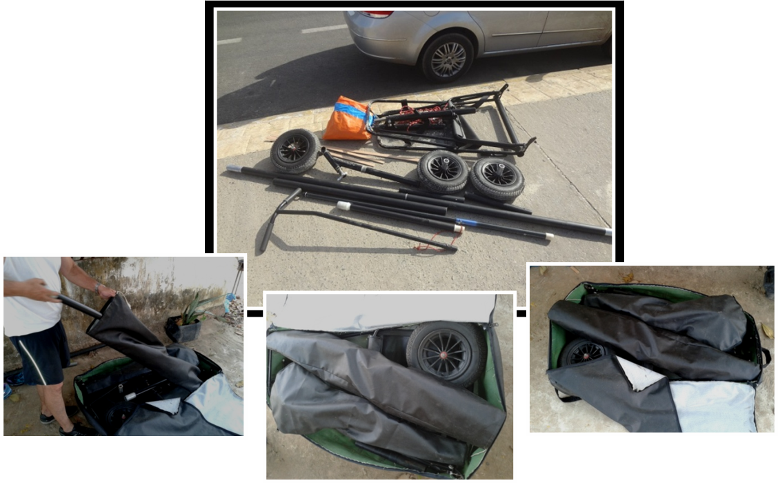 Estrutura totalmente desmontável, sendo rodas, eixos, mastro, rebatimento do encosto, mastro dividido em duas ou três seções, dependendo do material, controle de direção removível, forquilha dianteira destacável.