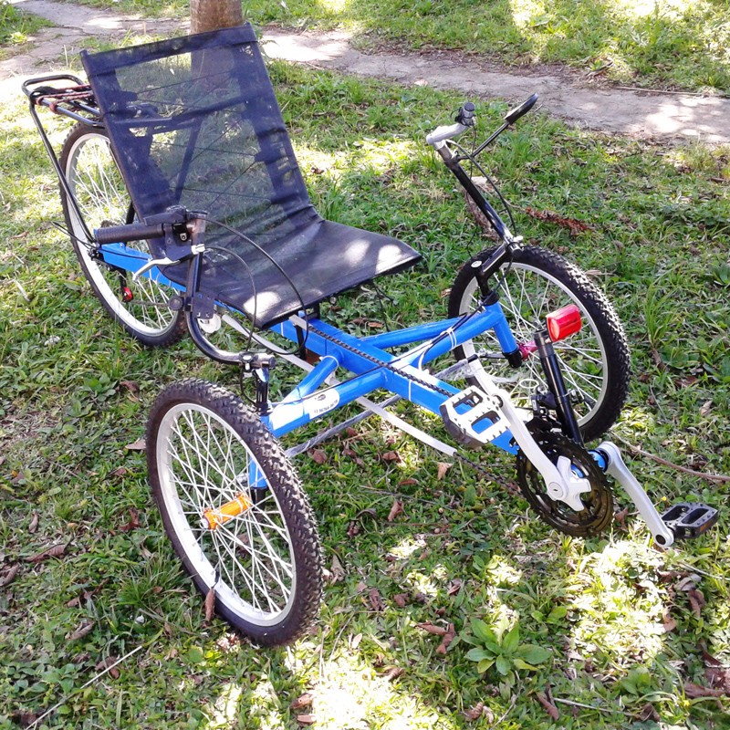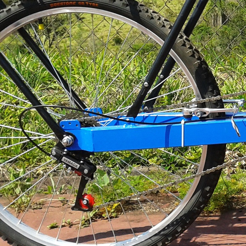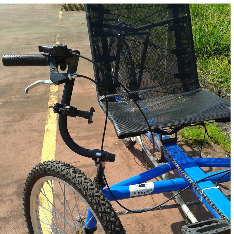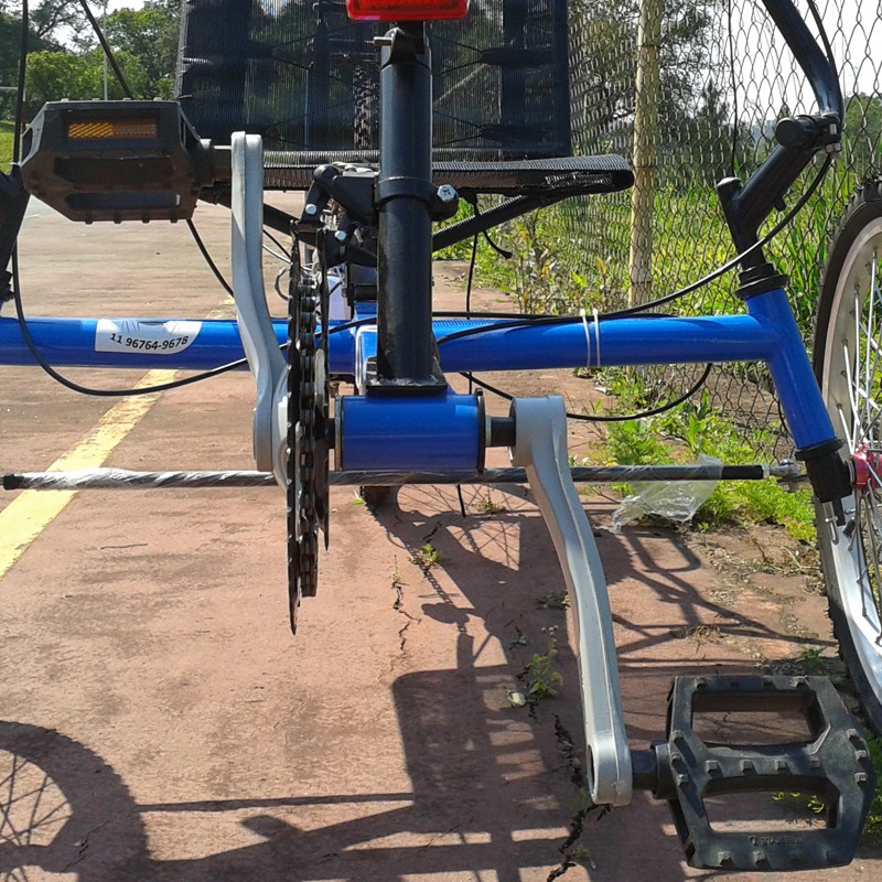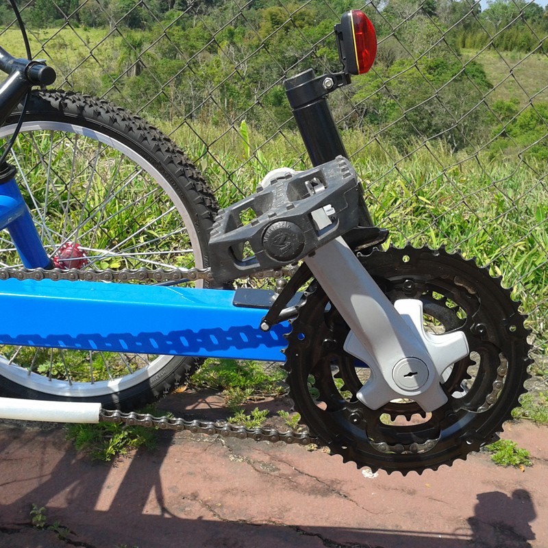 Possui um de pê de vela com uma coroa de Z= 42, câmbio traseiro catraca de sete V, freios mecânicos VB Break. Rodas dianteiras aro 20 simples, cubo de alumínio com rolamentos sem blocagem. Roda traseira aro 26 simples cubo de alumínio com rolamentos sem blocagem.